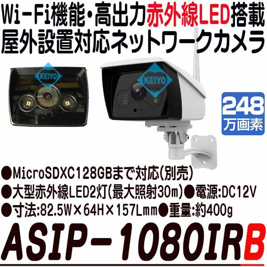 ASIP-1080IRBの概要 ASIP-1080IRBは、200万画素屋外設置対応Wi-Fiネットワークカメラです。最大照射距離30mに対応した高出力赤外線LED2個搭載。デイナイト機能により、明るい時はカラー映像、暗くなったらLED光を照射して高感度モノクロ映像で撮影します。記録媒体にはmicroSDカード(別売)を採用しており、最大128GBまで対応します。