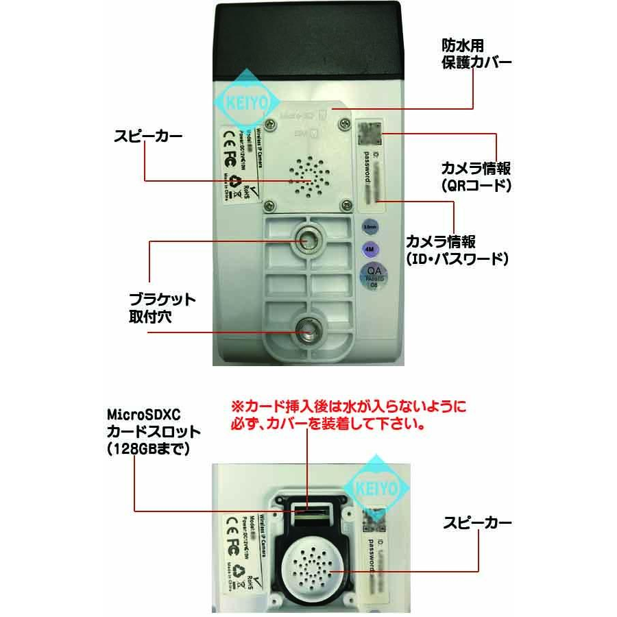 簡単接続を可能にするQRコード付 本体底面にはカメラIDを登録済みQRコードを搭載しています。専用アプリのMIPCから読み込むことで、ID情報を取り込めます。