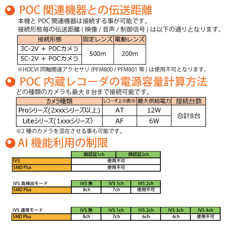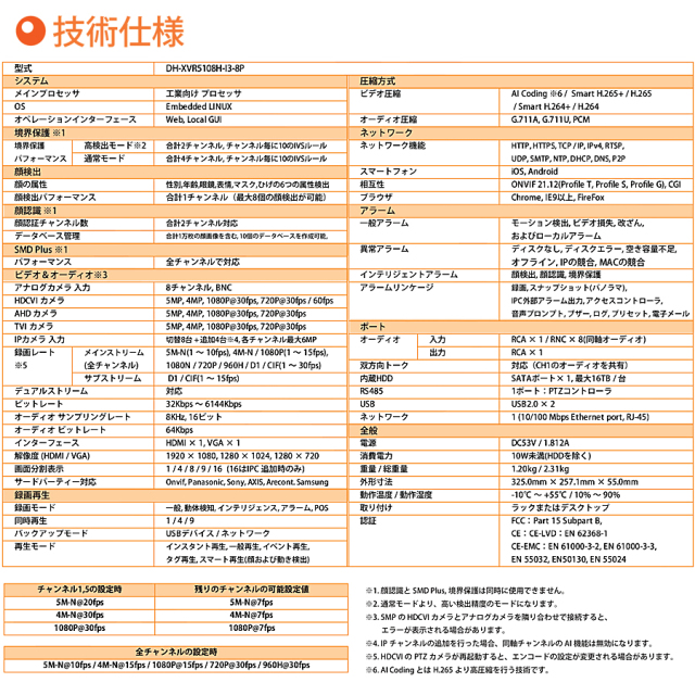 | 対応入力カメラ解像度 | 【HDCVI】5MP, 4MP, 1080P @30fps 720P @30, 60fps 【AHD】5MP, 4MP, 1080P @30fps 720P @30fps 【TVI】5MP, 4MP, 1080P @30fps 720P @30fps 【IP】1chにつき最大6.0MPまで(切替8台+追加4台) |