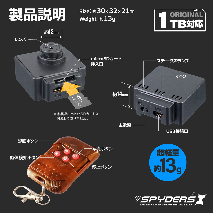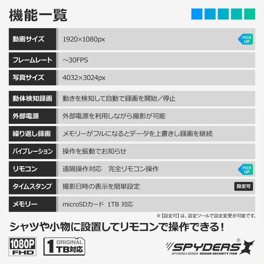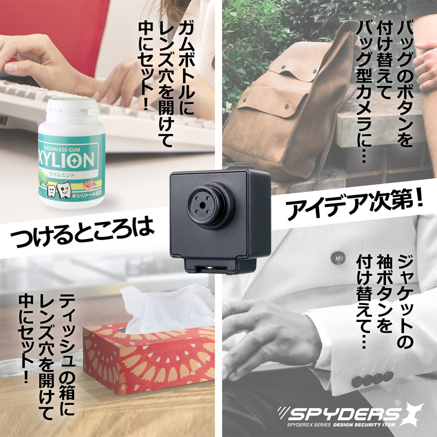 スパイダーズX F-805の概要 F-805は、偽装カメラ(擬装カメラ)(スパイカメラ)関連のトップメーカーであるオンスクエア社が展開する、スパイダーズXシリーズのフルHD(1920×1080)録画対応ボタン偽装(擬装)小型カメラです。記録媒体にはmicroSDカードを採用しており、最大で1TBまで対応。わずか13gほどの軽量仕様の為、普段使いのシャツ等に取り付けてハンズフリーでの撮影が可能です。シンプルな構造なので、アイディア次第で様々なシチュエーションでの活躍に期待ができます。【その他のおススメ小型カメラ(スパイカメラ)(偽装カメラ)はコチラをご覧ください】