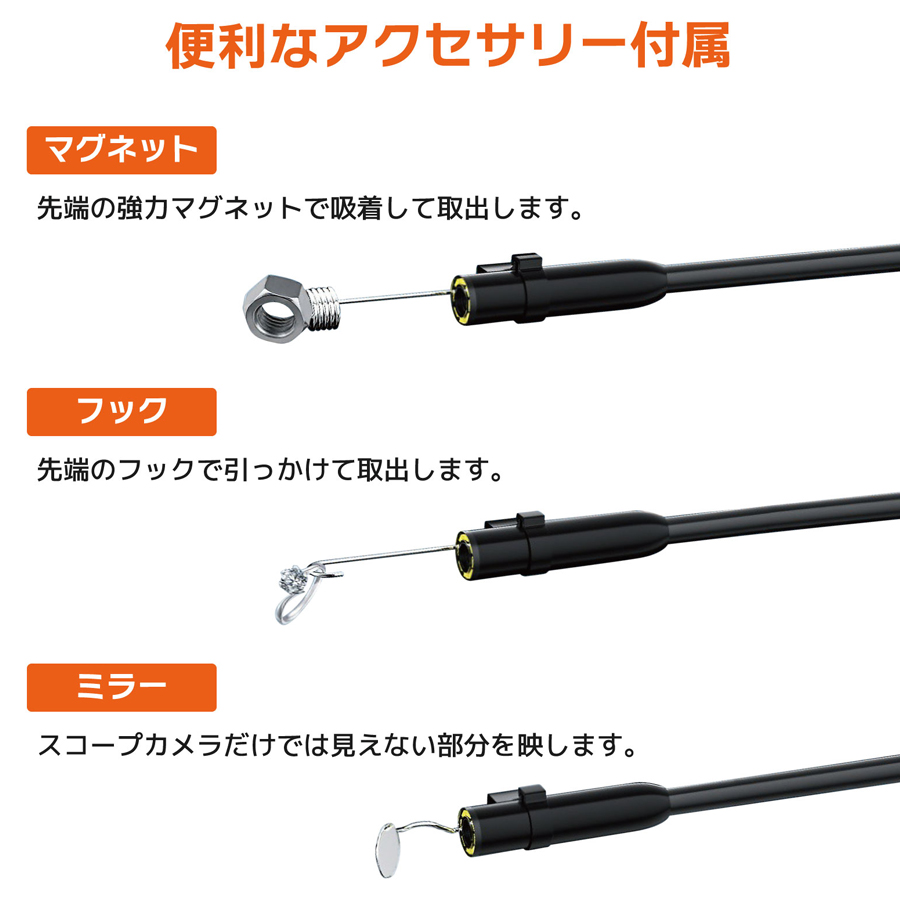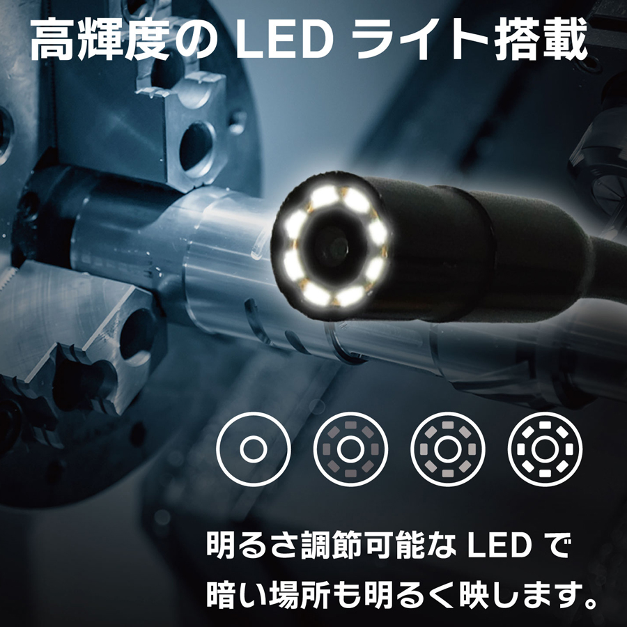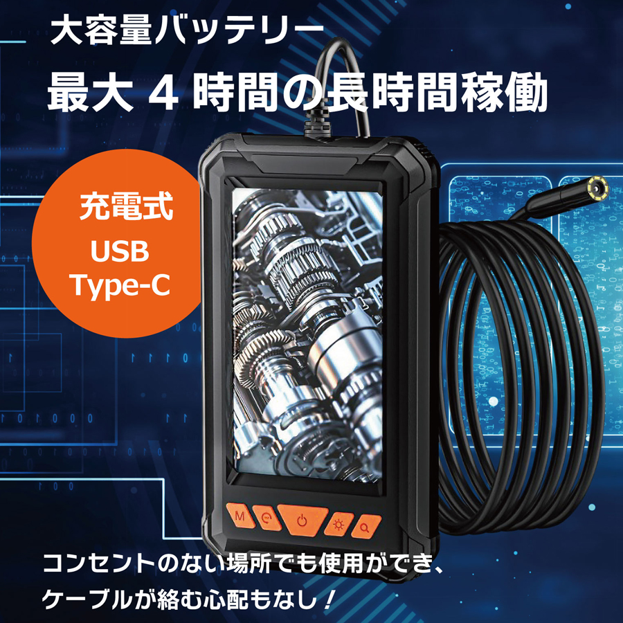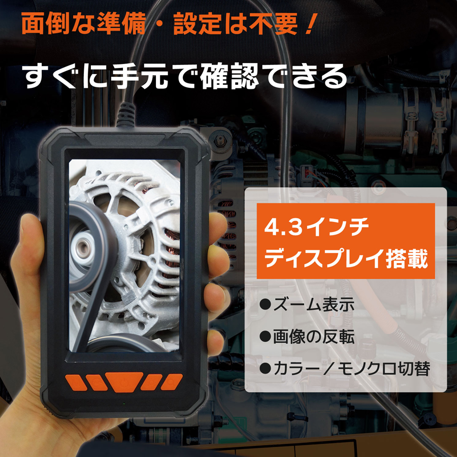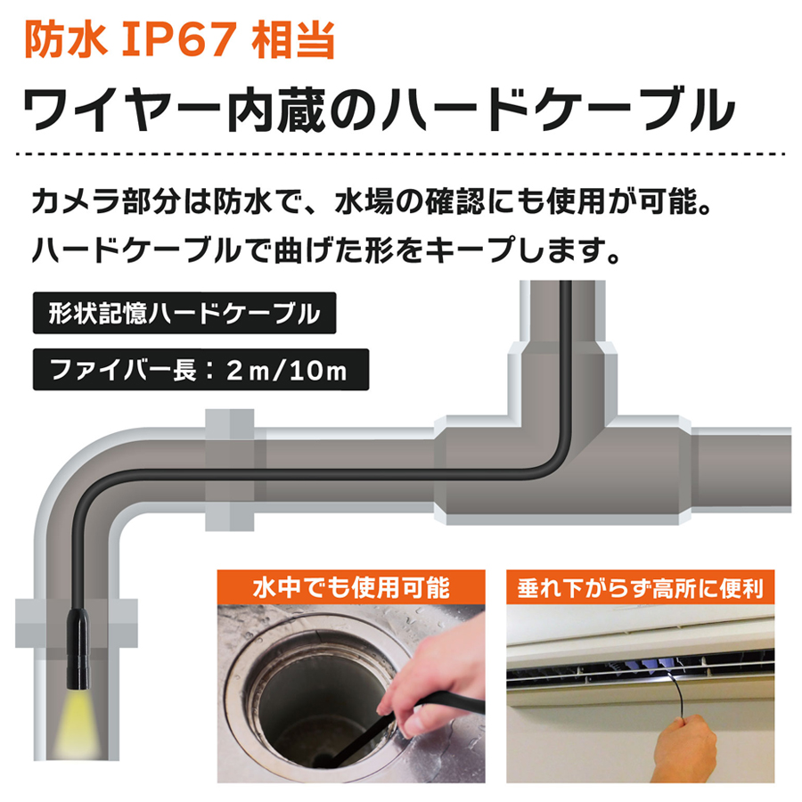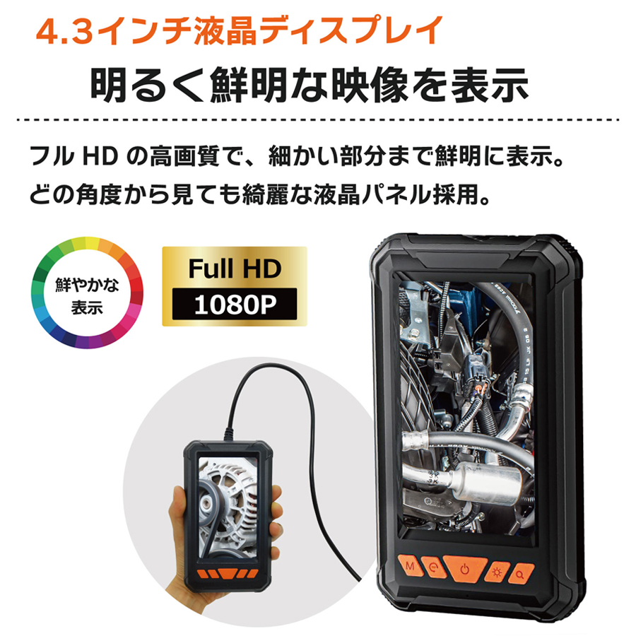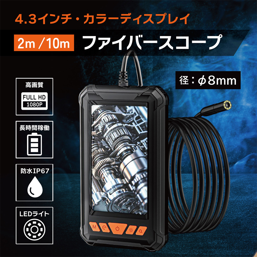 FIB-LCAM-1LA-2Mの概要 FIB-LCAM-1LA-2Mは、高画質1080P・IP67相当の防水仕様に対応した工業用内視鏡ファイバーケーブルカメラです。LEDライト搭載のカメラヘッド部は直径8mm。ワイヤー内蔵の形状記憶ハードケーブルの長さは約2mです。フル充電で約4時間動作し、4.3インチの液晶ディスプレイ付きで視認性にも優れています。
