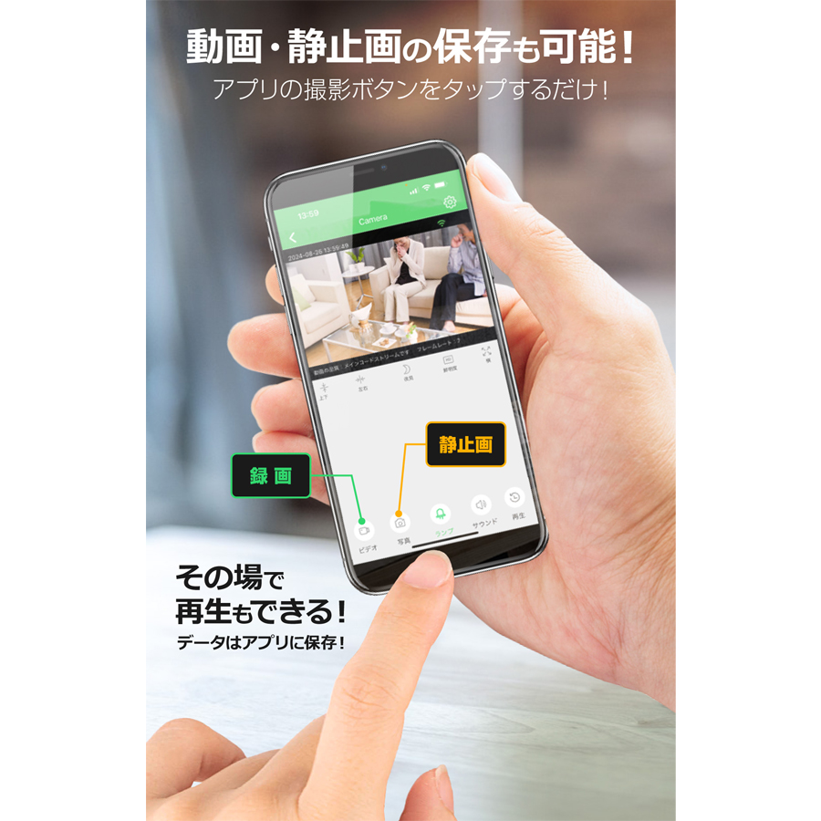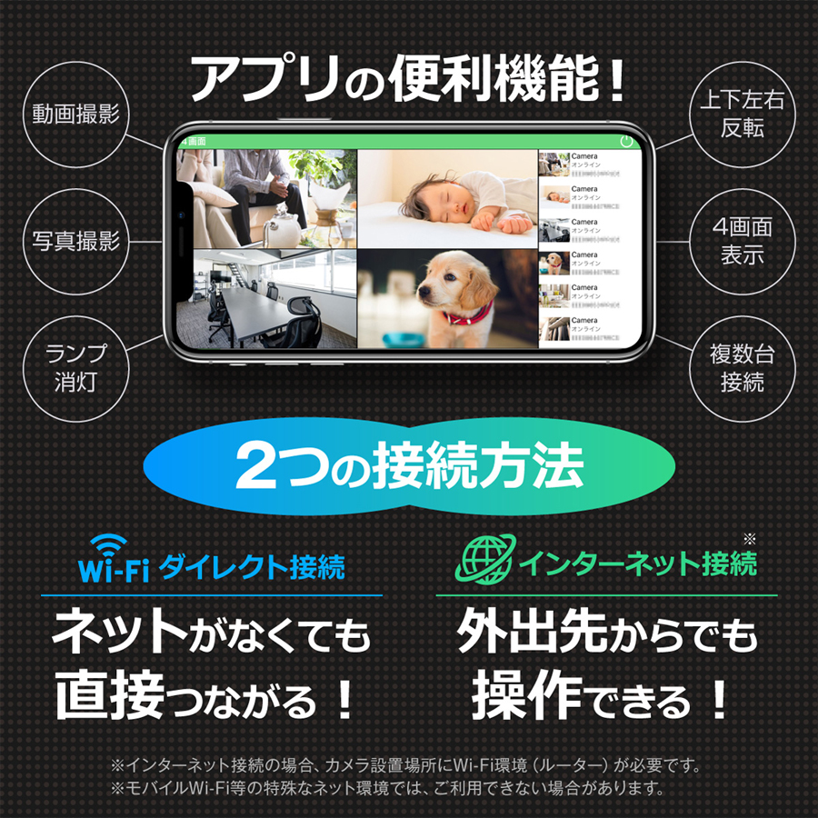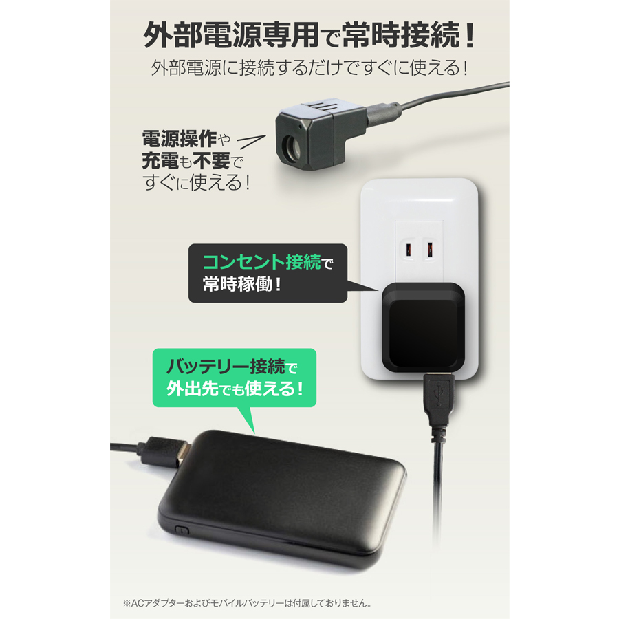 | 製品機能 | 動画撮影, 静止画撮影, 外部電源, 繰り返し録画, オート録画, Wi-Fi接続(ダイレクト接続・インターネット接続)※一部機能はスマートフォンやタブレットが必要となります |