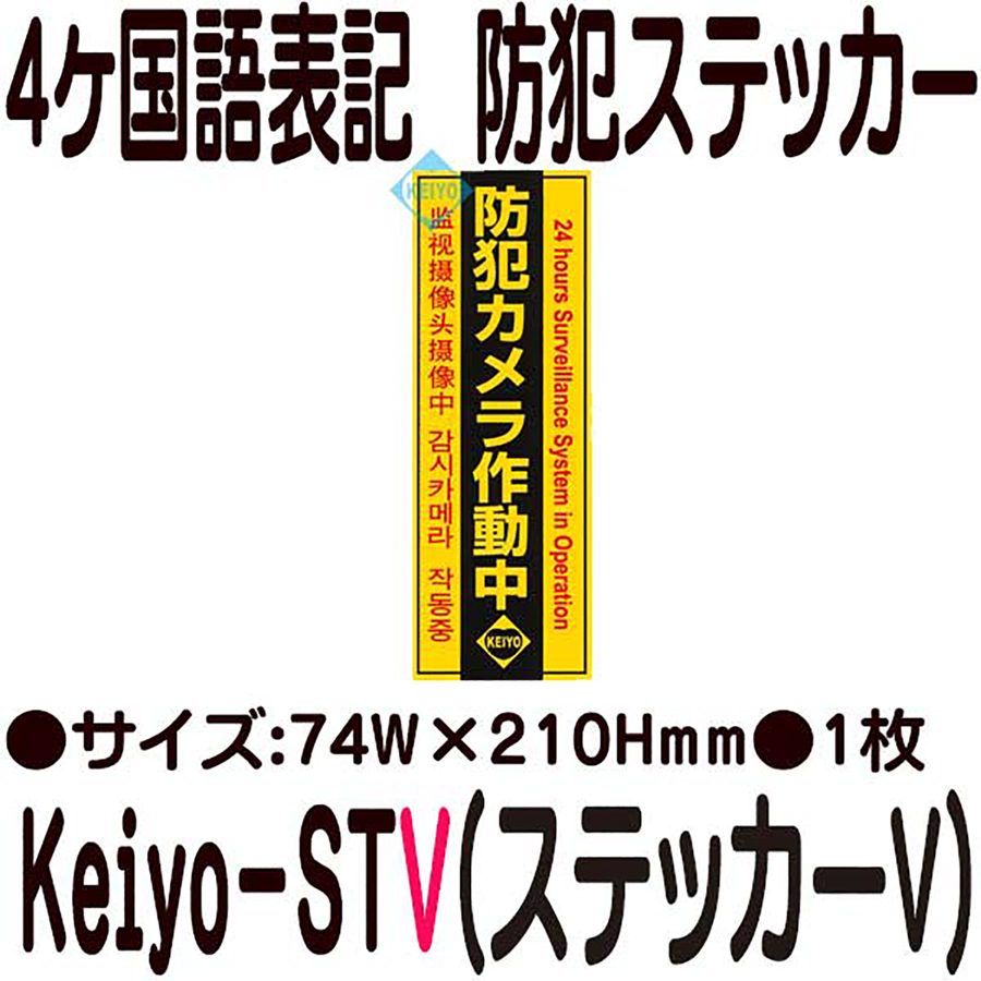 Keiyo-STVの概要 Keiyo-STV ケイヨーステッカーV(縦型)は、74W×210Hmmサイズの4ヶ国語表記仕様黄色下地の防犯ステッカーです。姉妹品に、100W×100Hmm正方形型デザイン[Keiyo-STS ケイヨーステッカーS(正方形型)]や、210W×74Hmm横型デザイン[Keiyo-STH ケイヨーステッカーH(横型)]もございます。現場に貼るだけで防犯効果のアップが期待でき、英語・中国語・韓国語・日本語の計4ヶ国語に対応した縦型防犯ステッカーです。防犯カメラや、目立たない小型防犯カメラ設置の補助に効果的です。ダミーカメラや センサーライトと組み合わせての使用もお勧めです。オトクな複数枚セット[Keiyo-STV10 防犯ステッカー縦タイプ10枚セット]のご用意もございます。