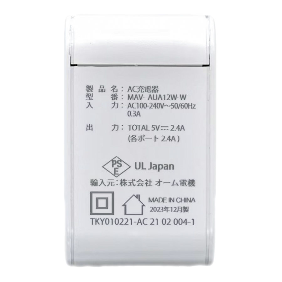 MAV-AUA12W-Wの概要 MAV-AUA12W-Wは、機器に適した出力を自動に選択して2台同時に急速充電可能な、 USB Type-A×2ポート搭載USB-AC充電器です。最大出力は12W/2.4Aに対応し、収納式スイングプラグを採用しているため省スペースでの活用が期待できます。姉妹品に、5W(5V, 1A)出力対応のUSB-ACアダプター[MAV-AU101N]や、USB Type-A×1ポート搭載で、5V/2.0Aモデル[MAV-AU211N]もございます。