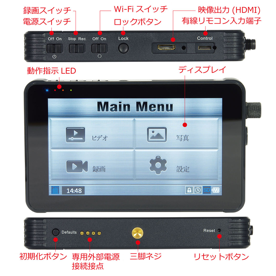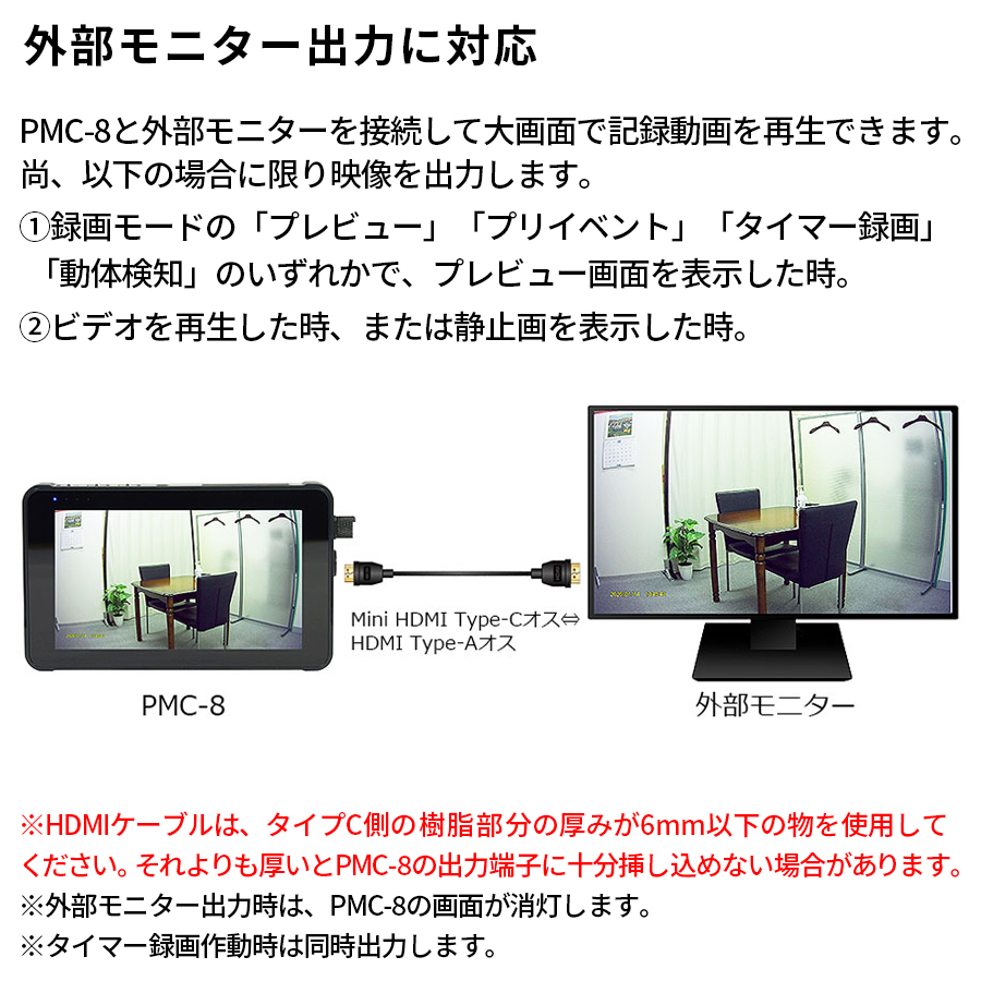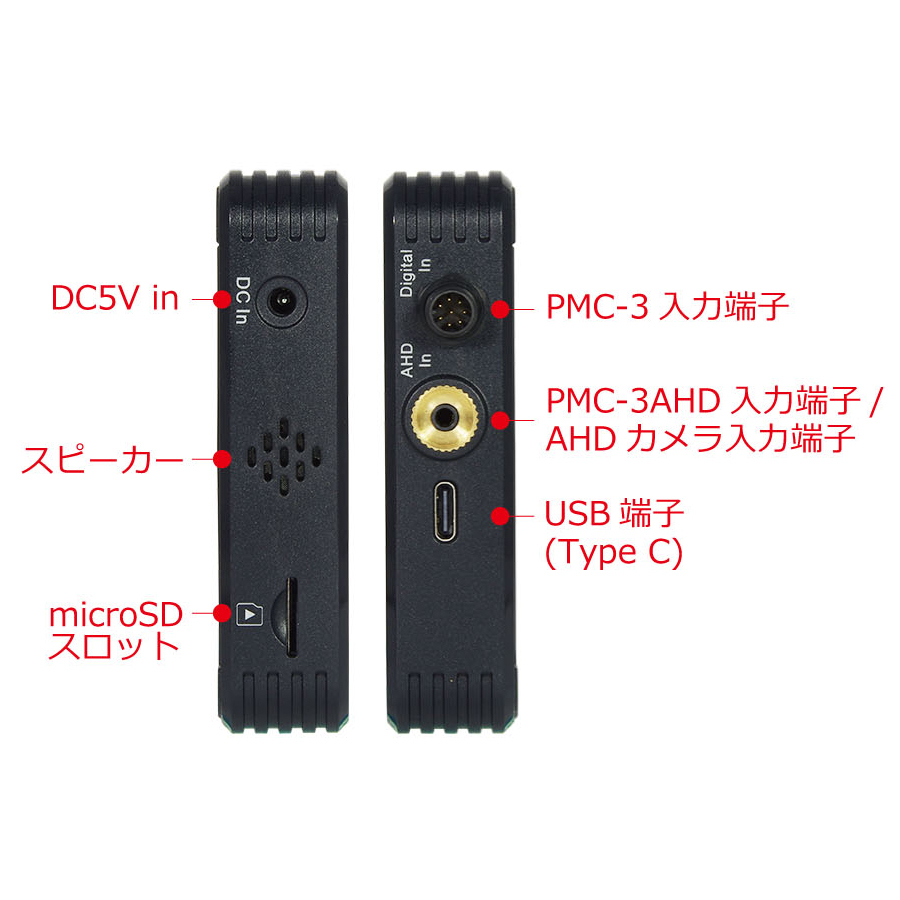 | 入出力端子 | 専用デジタルカメラ「PMC-3」用入力×1, 専用AHDカメラ「PMC-3AHD」用入力(DC5V Max250mA供給)×1, 有線リモコン入力×1, HDMI映像出力×1, USB端子×1(※3), DC5V電源入力端子×1 |