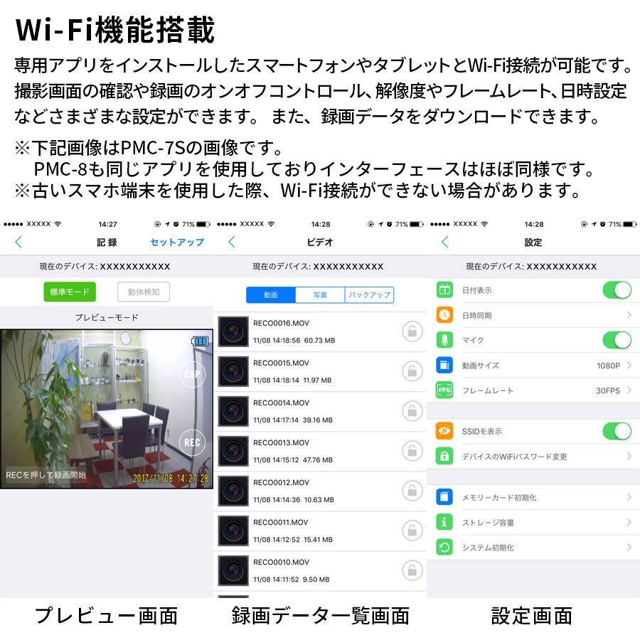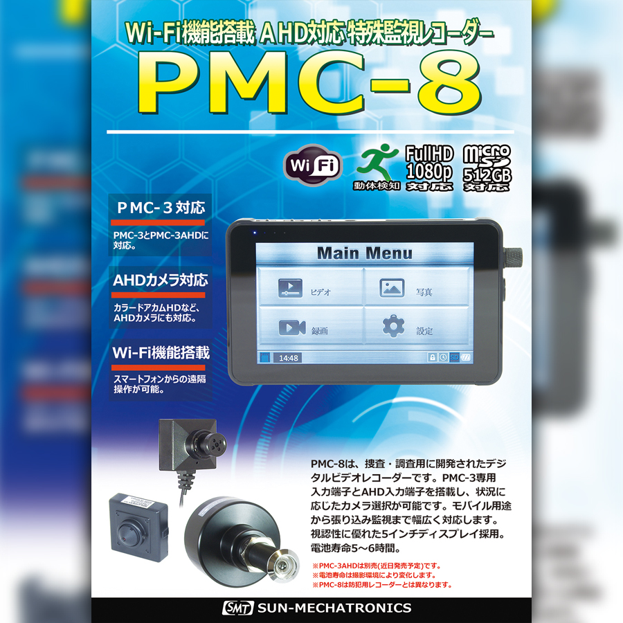PMC-8+PMC-3セットの概要 PMC-8+PMC-3セットは、情報機器を多く手掛ける老舗メーカー サンメカトロニクス社製の、AHD対応タッチパネル液晶Wi-Fi機能搭載レコーダー[PMC-8]と、フルHDネジ・ボタン型カメラ[PMC-3]のセット商品です。【その他のおススメ小型カメラ(スパイカメラ)(偽装カメラ)はコチラをご覧ください】