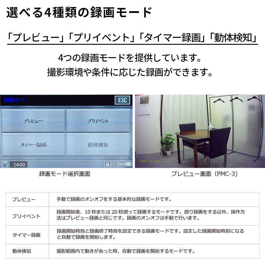 | 録画モード | プレビュー(マニュアル録画), プリイベント(遡り録画), タイマー録画, 動体検知 |