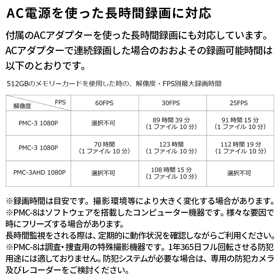 - 動体検知録画設定の場合でも駆動時間が伸びるわけではございません。