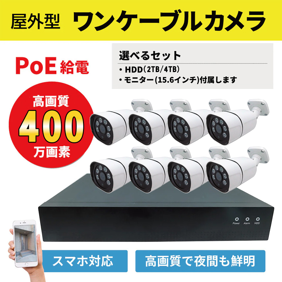 SEC-N-8M-16Lの概要 SEC-N-8M-16Lは、400万画素屋外用ワンケーブルバレット型防犯カメラ8台と、リンクポート付4ポートハブ1台、HDD録画機1台、15.6インチモニターのセット商品です。カメラは赤外線照射機能を搭載した単焦点のバレット型です。屋外への設置にも対応した防雨型となるため、様々な場所に設置が可能となります。録画機は、HDD(ハードディスク)を内蔵しており、受信と録画が兼用となる事で、よりシンプルな構成で運用が可能となります。録画機の容量は、2TB(追加料金なし)・4TB(+11,000円)からお選びください。