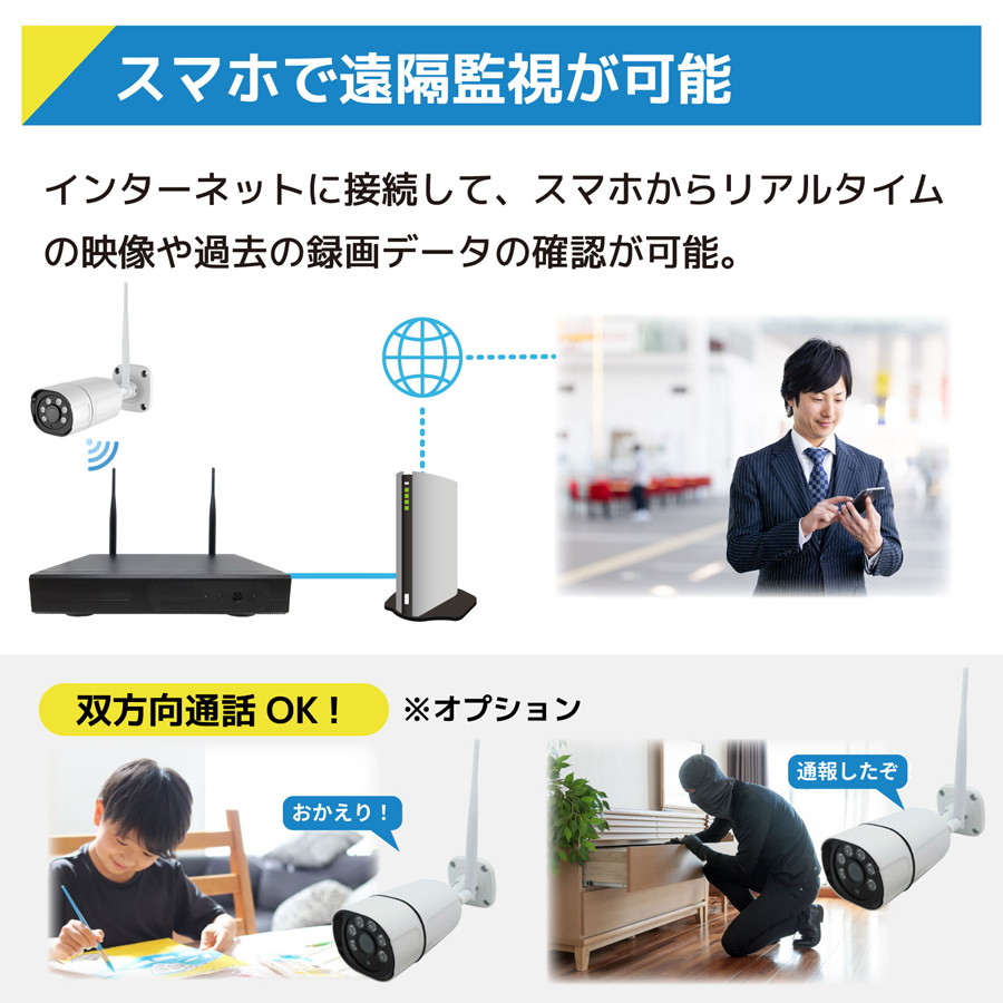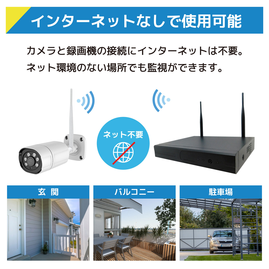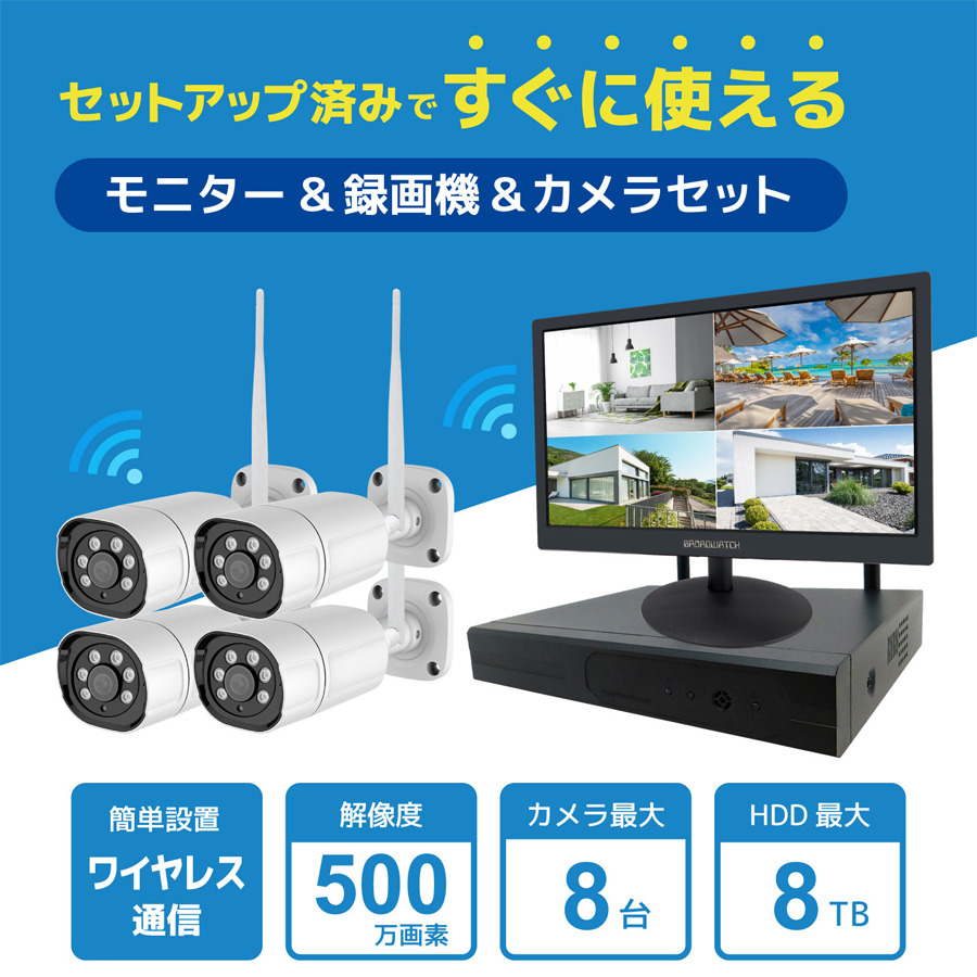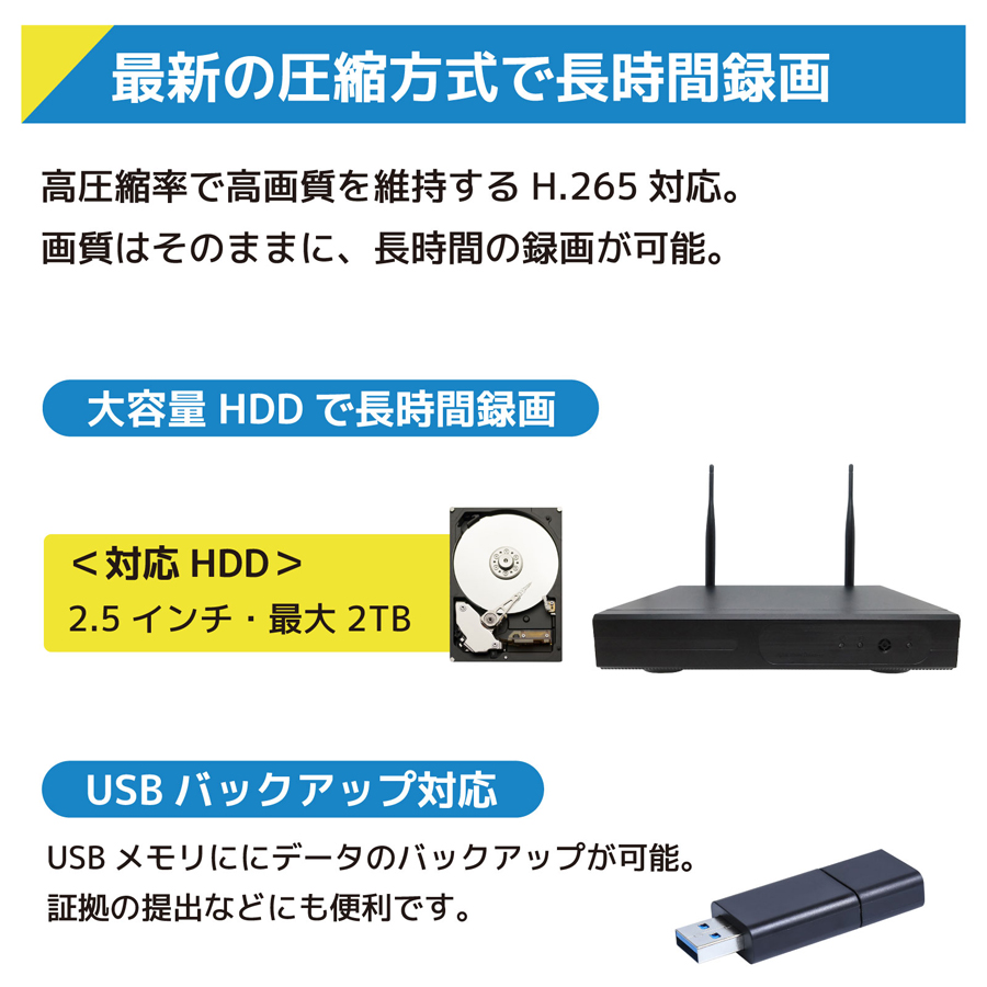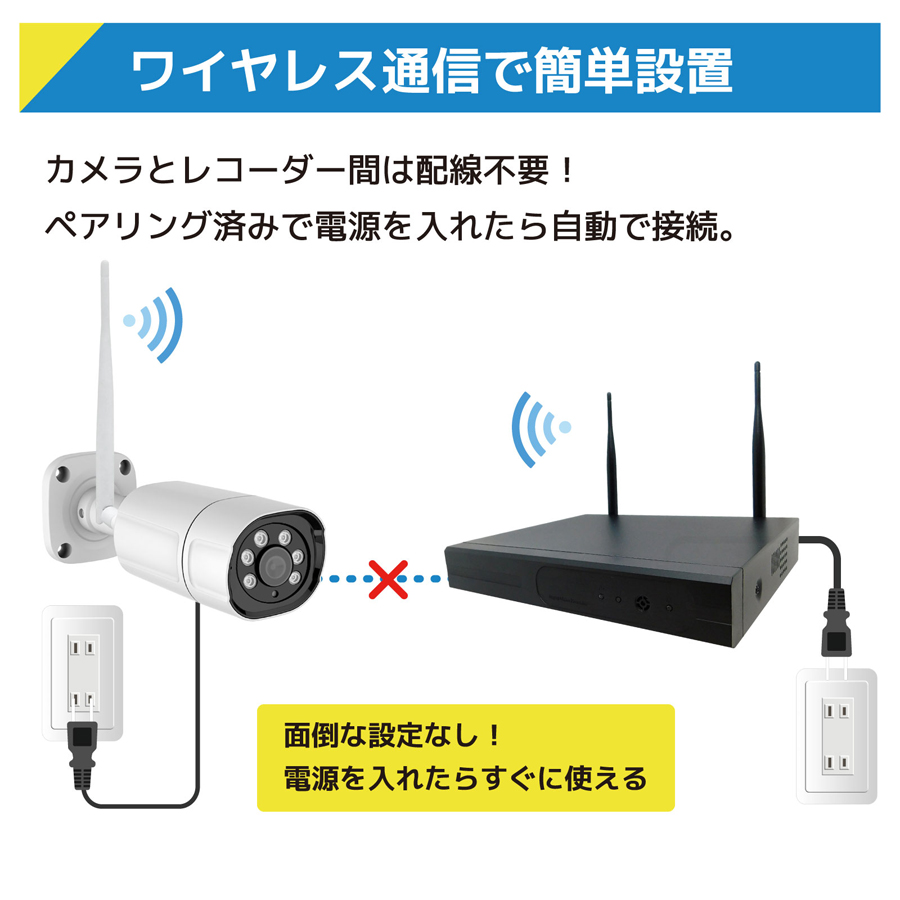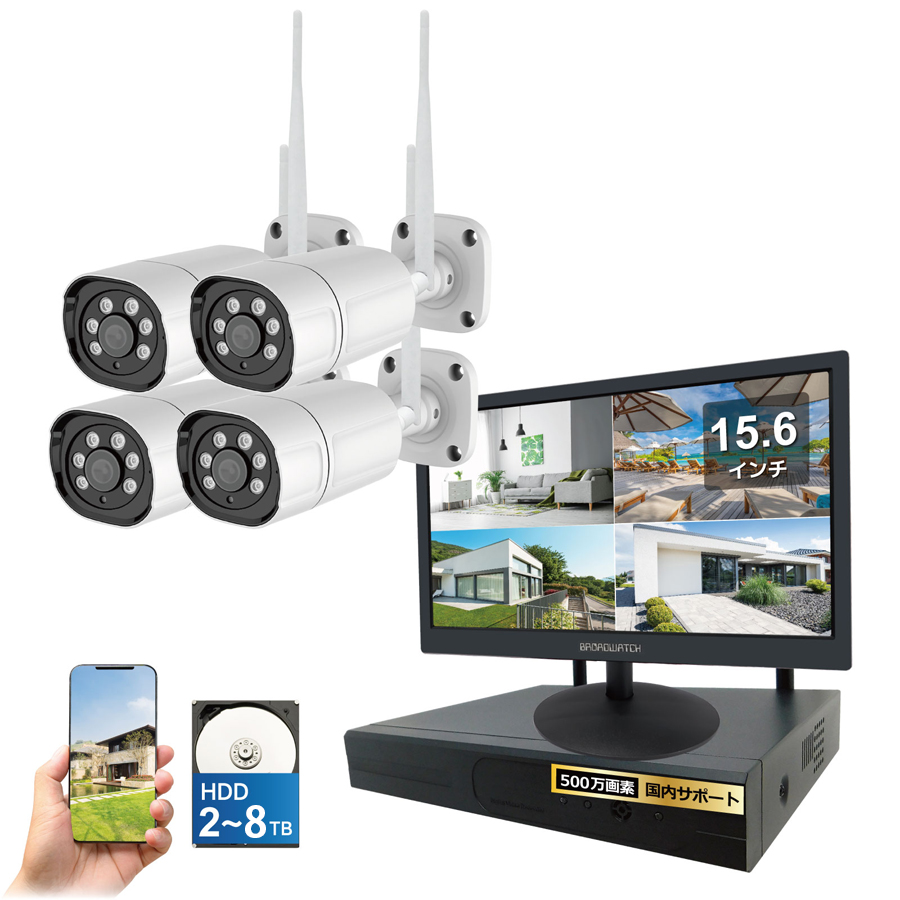 SEC-W-G4CH-16L-2Tの概要 SEC-W-G4CH-16L-2Tは、屋外設置対応の500万画素ワイヤレスバレット型防犯カメラ4台と、LCD16インチ録画機分離型セット商品です。カメラは自動点灯式赤外線照射機能を搭載した単焦点のバレット型です。録画機は、HDD(ハードディスク)を2TB内蔵したセパレート型録画機となっています。受信と録画が兼用となる事で、よりシンプルな構成で運用が可能となります。録画機の容量は、2TB(追加料金なし)・4TB(+11,000円)・8TB(+49,500円)からお選びください。