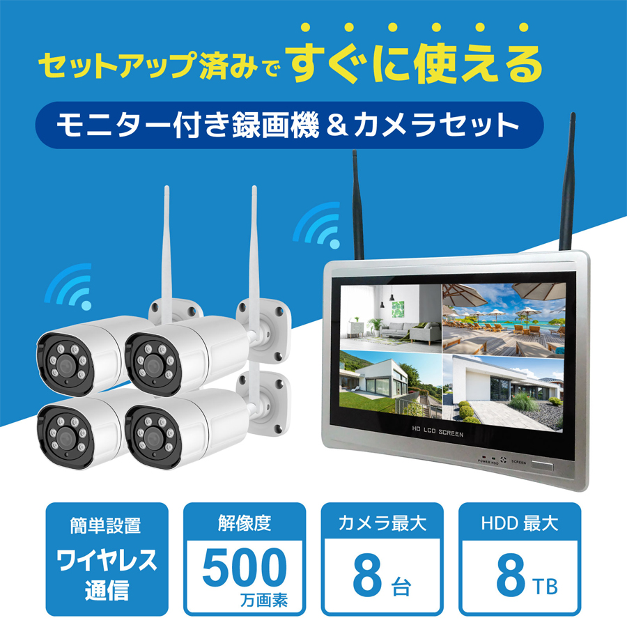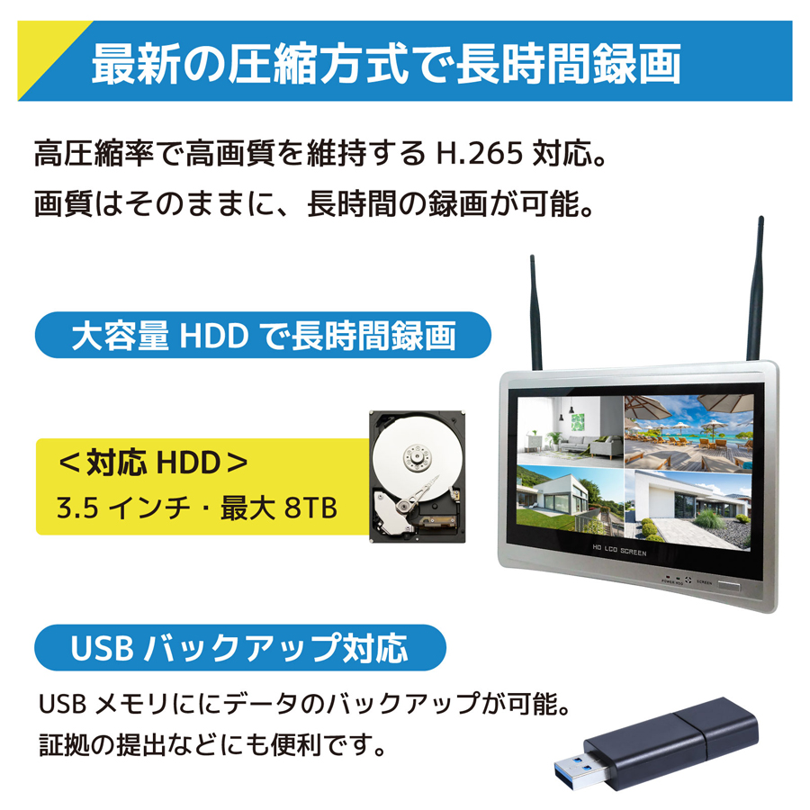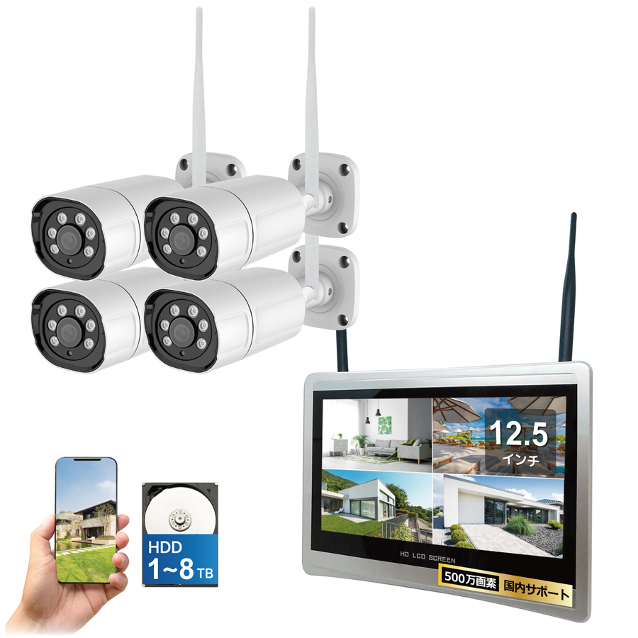 SEC-W-GL4CH-1Tの概要 SEC-W-GL4CH-1Tは、屋外設置対応の500万画素ワイヤレスバレット型防犯カメラ4台と、12.5インチLCDモニター搭載HDD録画機1台のセット商品です。カメラは自動点灯式赤外線照射機能を搭載した単焦点のバレット型です。録画機は、HDD(ハードディスク)を1TB内蔵した12.5インチLCDモニター搭載の受信機兼録画機となっています。受信と録画が兼用となる事で、よりシンプルな構成で運用が可能となります。録画機の容量は、1TB(追加料金なし)・2TB(+5,500円)・4TB(+13,200円)・8TB(+44,000円)からお選びください。