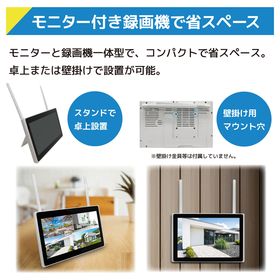 壁掛けも可能なディスプレイ一体型録画機 録画機を搭載した10インチモニターで省スペースでの運用が可能。