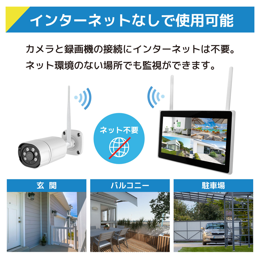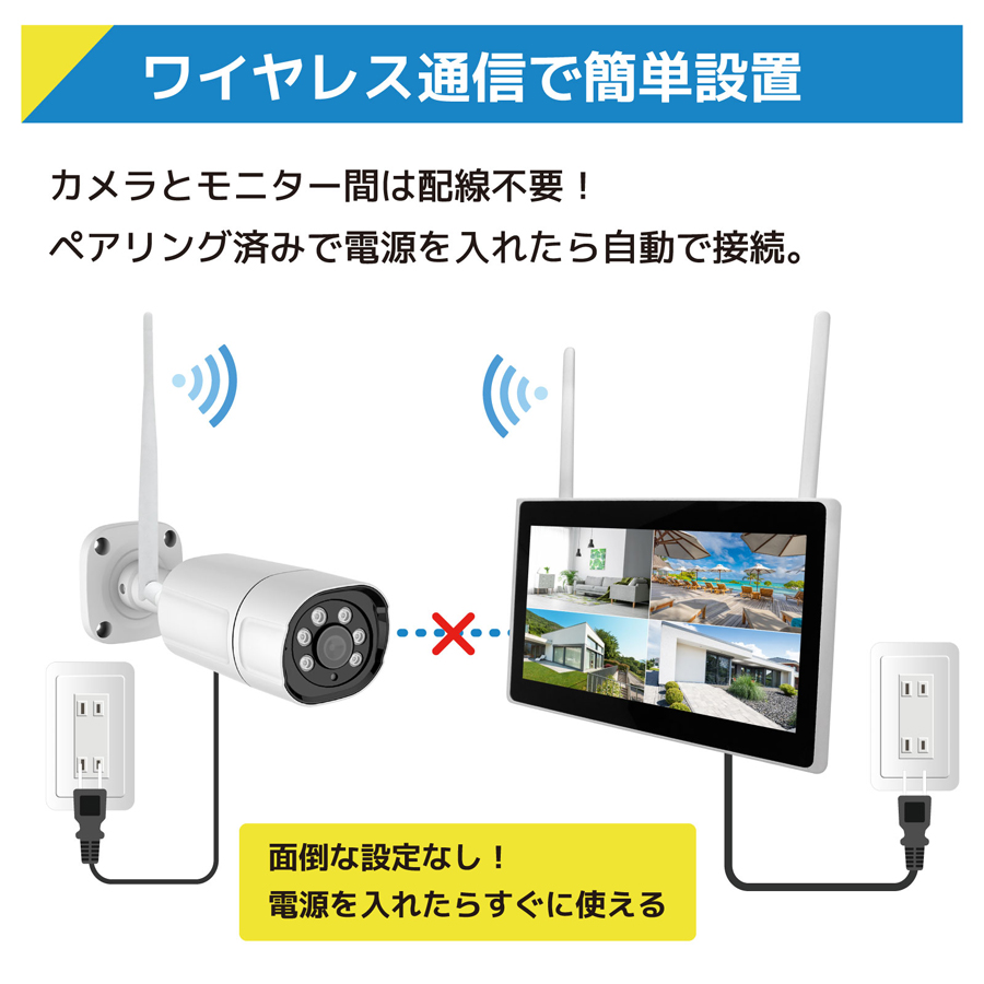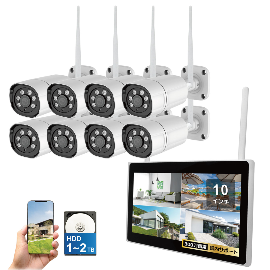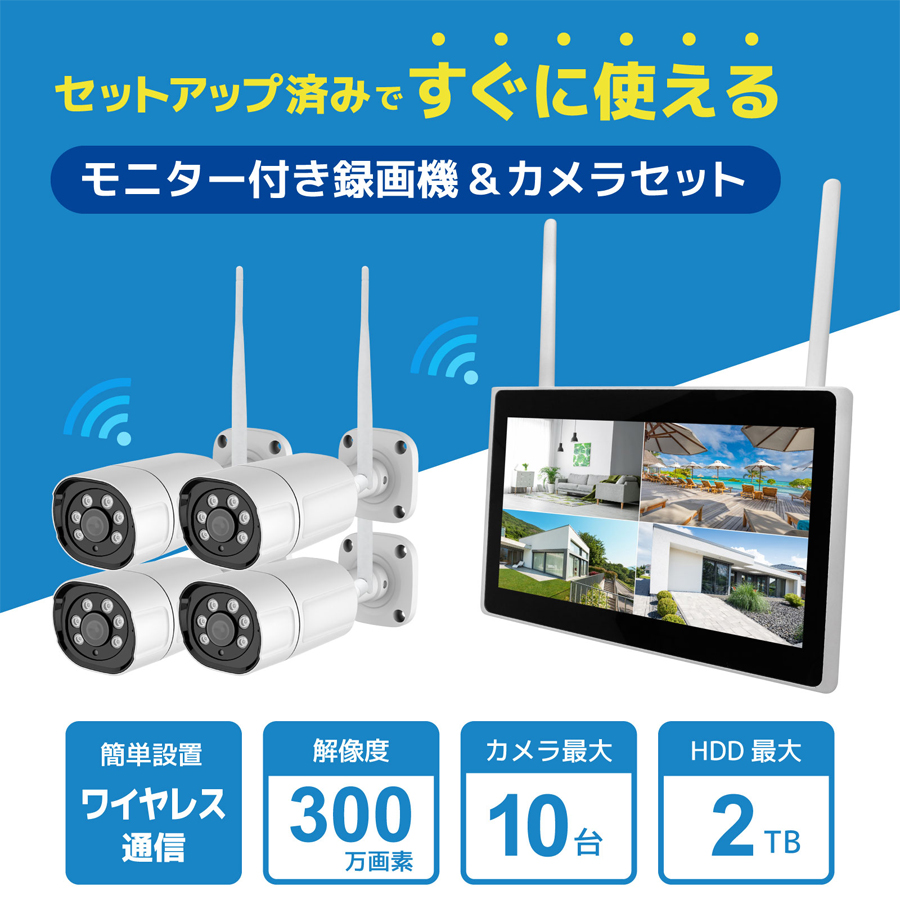 SEC-W-ML5H-10L-1Tの概要 SEC-W-ML5H-10L-1Tは、屋外設置対応の300万画素ワイヤレスバレット型防犯カメラ5台と、10インチLCDモニター搭載HDD録画機1台のセット商品です。カメラは自動点灯式赤外線照射機能を搭載した単焦点のバレット型です。録画機は、HDD(ハードディスク)を1TB内蔵した10インチLCDモニター搭載の受信機兼録画機となっています。受信と録画が兼用となる事で、よりシンプルな構成で運用が可能となります。録画機の容量は、1TB(追加料金なし)・2TB(+14,300円)からお選びください。