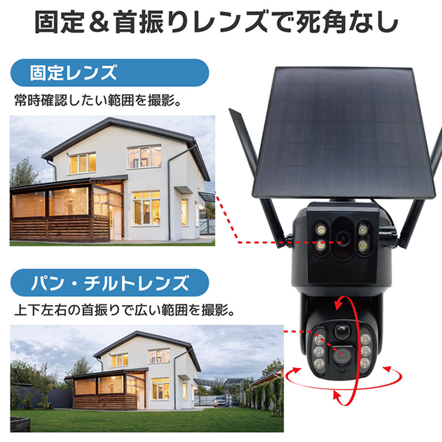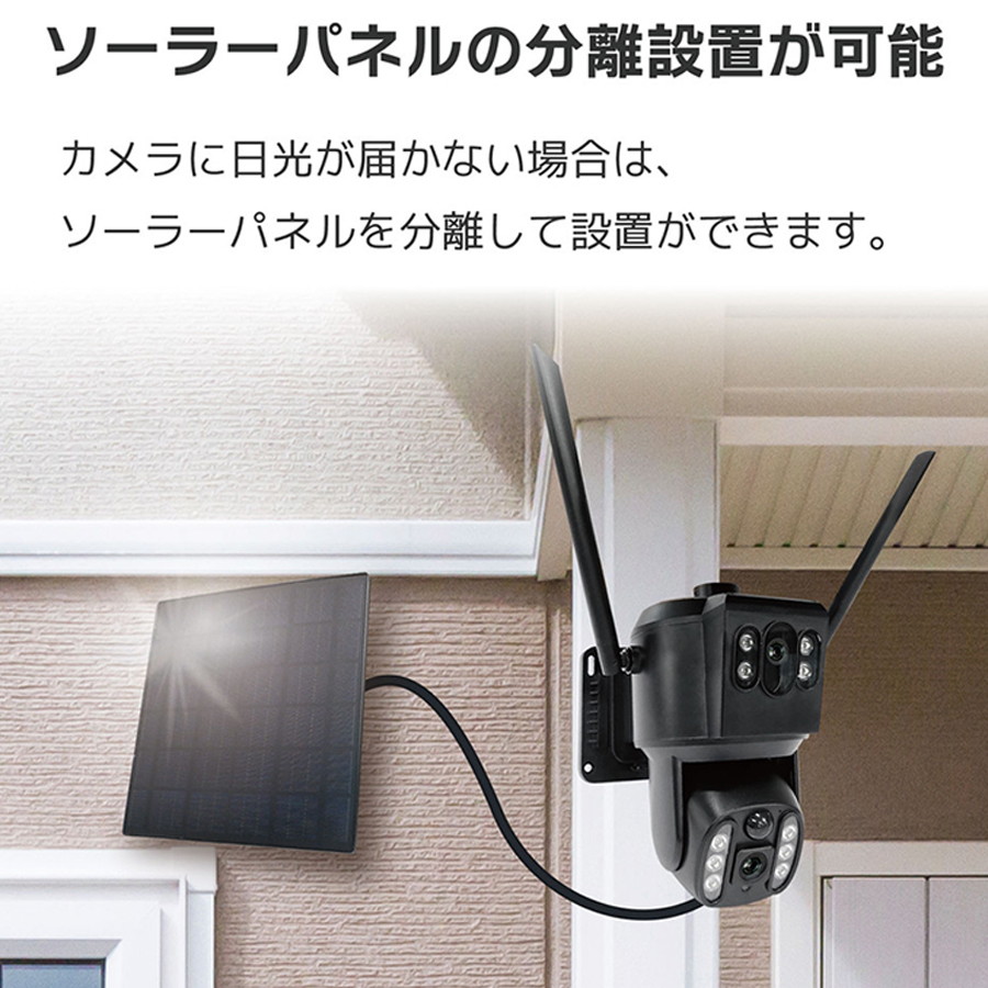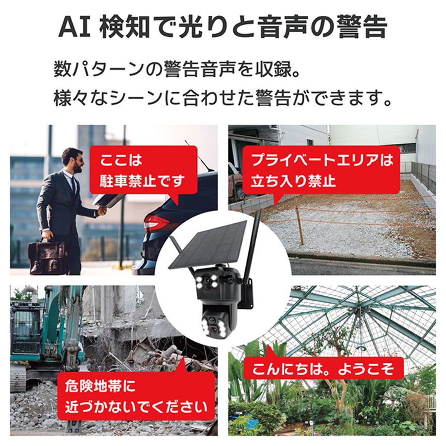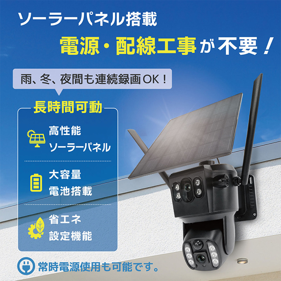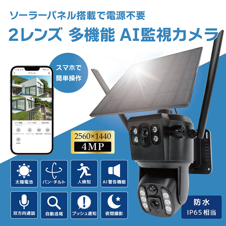 SEC-W2CAM-S4Mの概要 SEC-W2CAM-S4Mは、ソーラーパネルとコンセントの2つの給電方式に対応した、AI認識機能付き赤外線照射機能搭載400万画素Wi-Fi防犯カメラです。パン・チルト機能を搭載し、遠隔操作で広い範囲の監視が可能な上、ダブルレンズを搭載しており夜間フルカラー撮影に対応しています。画像認識によるAI機能により人のみ検知して自動で追尾し撮影し、侵入があれば警報音がなるため、効果的な防犯対策が可能です。