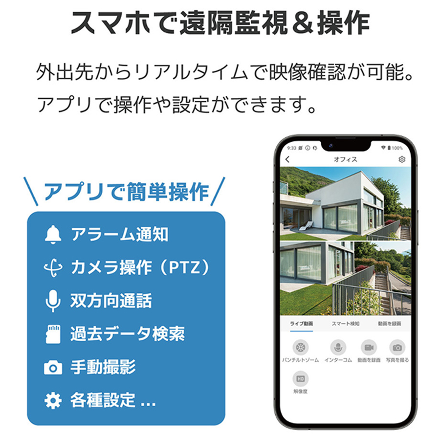 | 保存方式 | microSD(最大256GB Class10以上推奨)(※別売), スマホアプリ内, クラウド(有料) |