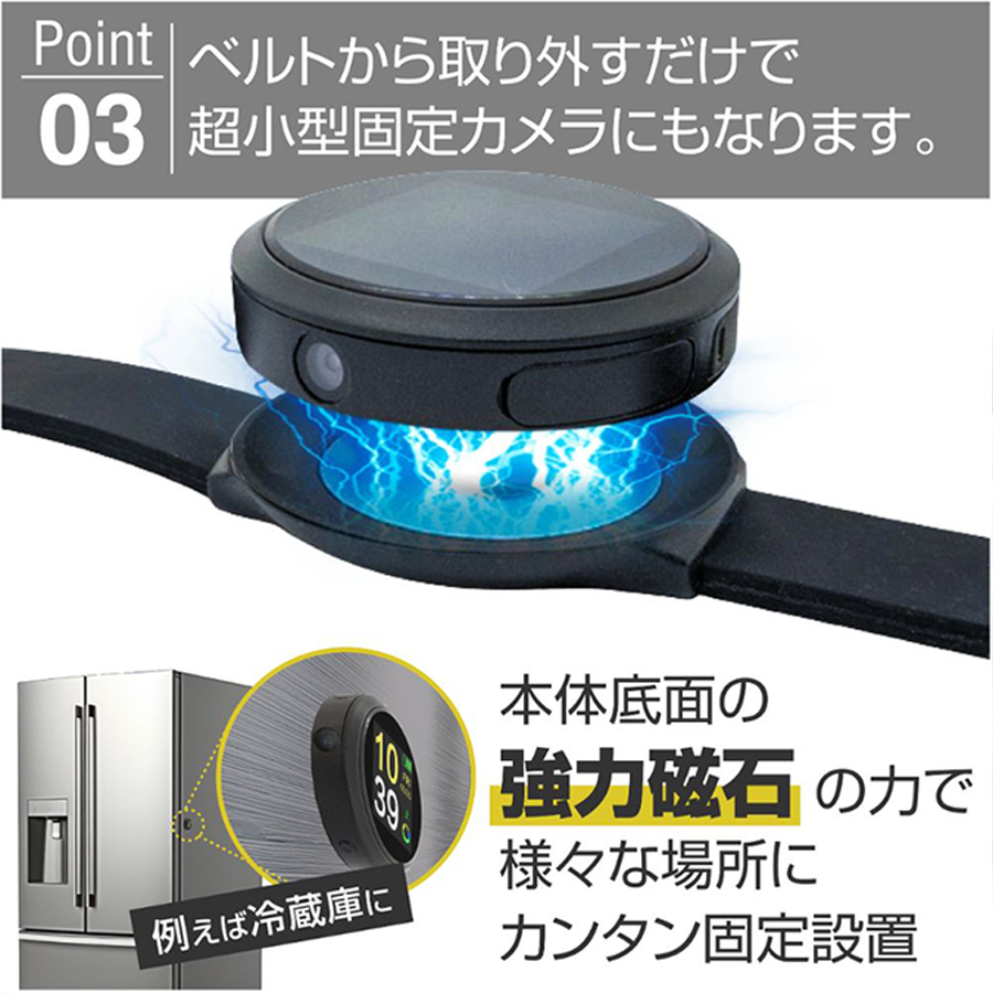 TK-SWA-03(Angle360)(アングル360)の概要 TK-SWA-03(Angle360)(アングル360)は、スパイカメラ(偽装カメラ)(擬装カメラ)を多く手掛ける匠ブランドの、フルHD(1920×1080)録画対応のスマートウォッチ偽装(擬装)小型カメラです。記録媒体にはmicroSDカードを採用しており最大で128GBまで対応します。本体が360°回転するため、撮影対象が移動した際でも無理なく自然にターゲットを追尾できます。また、本体をベルトから取り外すことが可能なので、超小型固定カメラとしても使用でき、2WAYビデオカメラとして運用いただくことも可能です。【その他のおススメ小型カメラ(スパイカメラ)(偽装カメラ)はコチラをご覧ください】