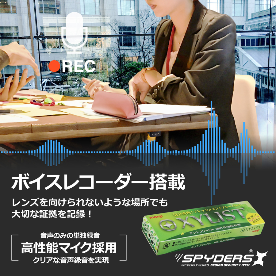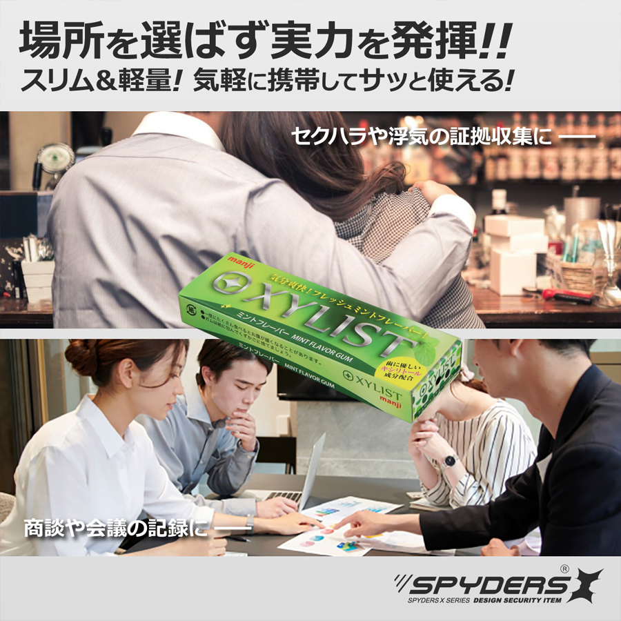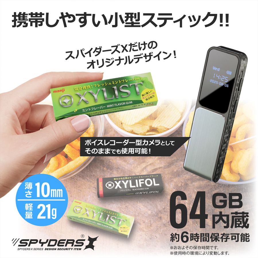 U-203の概要 U-203は、偽装カメラ(擬装カメラ)(スパイカメラ)関連のトップメーカーであるオンスクエア社が展開するスパイダーズXシリーズのフルHD(1920×1080)録画対応ガム偽装(擬装)小型カメラです。ユニット単体でもボイスレコーダー型カメラとしてのご使用が可能です。記録媒体に64GBの内蔵メモリを採用しており約6時間の動画が保存できます。【その他のおススメ小型カメラ(スパイカメラ)(偽装カメラ)はコチラをご覧ください】