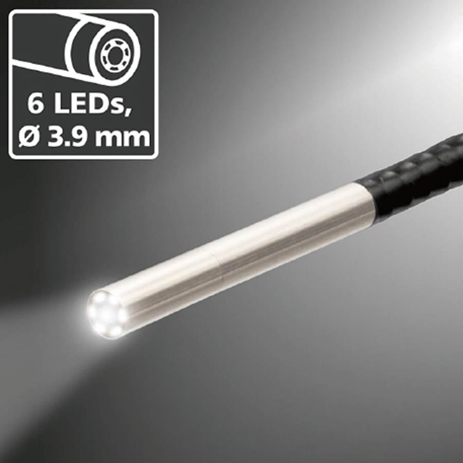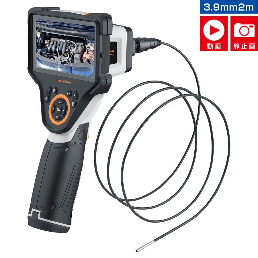ビデオフレックスHDマイクロ(VIDEOFLEX HD MICRO)の概要 ビデオフレックスHDマイクロ(VIDEOFLEX HD MICRO)は、5インチ大画面カラーモニター搭載、カメラ先端部にLEDを内蔵した、工業用内視鏡です。耐油仕様カメラケーブルのため、エンジンなど機械内部の検査でも活躍が期待でき、住宅の水回り設備やエンジンルームなど、小回り確認にも最適な固定カメラケーブルです。ケーブルの長さは2mで、直径3.9mmのカメラヘッド、カメラ部は完全防水仕様(IP67)となっています。静止画・動画の確認・撮影・保存が親指ひとつで行える簡単オペレーションです。記録媒体にmicroSDカードを採用しており、最大32GBまで対応しています。