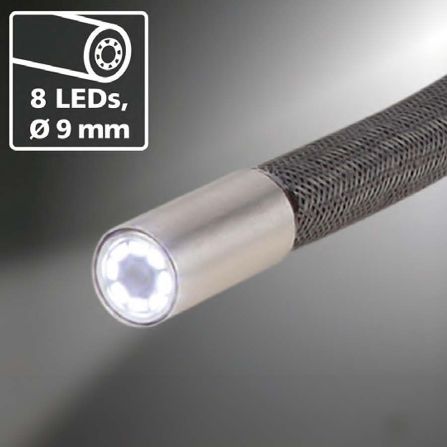 ビデオインスペクター3DX(VIDEO INSPECTOR 3DX)の概要 ビデオインスペクター3DX(VIDEO INSPECTOR 3DX)は、ジョイスティック操作で自在に先端カメラを操り、手の届かない場所の確認・撮影・保存ができる先端可動式の工業用内視鏡です。静止画・動画解像度は1280×720ピクセルのHD画質で、高精度な検査を実現。直径9mm、長さ1m、IP67の防水(海水対応)・耐油ケーブルの先端には8つのLEDを搭載しており、マグネットホルダーマウント付きで磁性体に本体を設置が可能です。記録媒体にはmicroSDカードを採用しており、最大32GBまで対応しています。