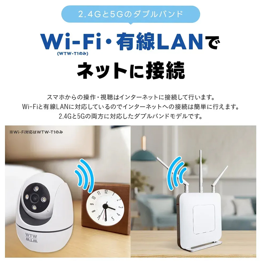 離れた場所からでも映像が見れるWi-Fi機能 カメラは、Wi-Fi機能を搭載しています。(IEEE 802.11b/g/n 2.4GHz対応)カメラがWi-Fiにつながっていると、どこにいてもスマホからライブ映像・録画データの確認を行えます。(※Wi-Fiは2.4GHzのみ対応。5GHzはご使用いただけません)