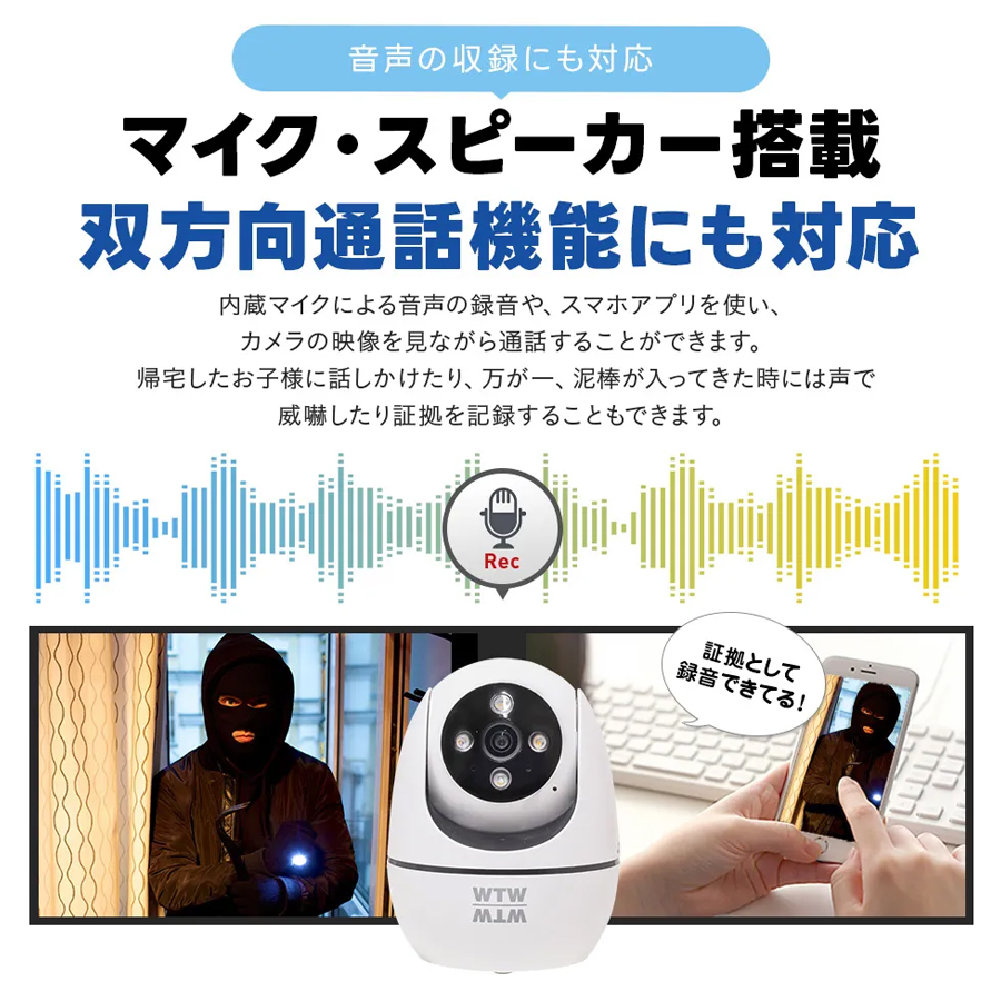 周囲の音も拾える高感度マイク・スピーカー内蔵 本体前面には、高感度マイクを搭載しております。ライブ映像、録画映像のどちらでも映像と一緒に音声も確認できます。背面にスピーカーも搭載しておりますので、家族と会話を行ったり不審者に対して、警告を行う事もできます。