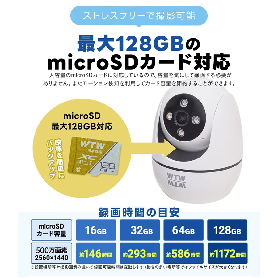 長期間の録画を可能にするMicroSDスロット 最大128GBまでのMciroSDカードに対応(別売)。SDカード容量がいっぱいになった際は、上書き録画を行います。SDカードに入っているデータは、パソコン等のカードリーダーに接続してデータの再生、コピー等が行えます。