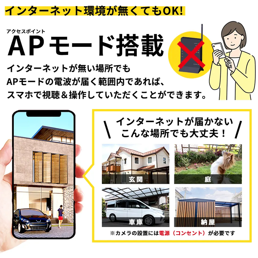 Wi-Fi環境がない場所でもスマホから直接接続できるAPモードに対応 本製品は、カメラへスマホからダイレクトに接続できるAPモード接続(アクセスポイント接続)に対応しております。ネット環境がない場所でもデータの確認やカメラの設定変更等が行えますので、自宅から離れた駐車場や工事現場等のネット環境もない環境での設置の際に便利な機能となっております。